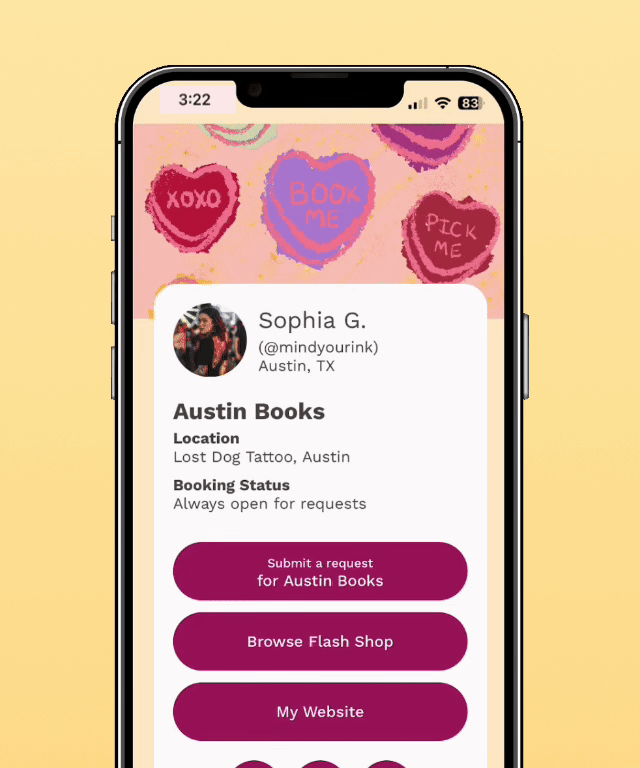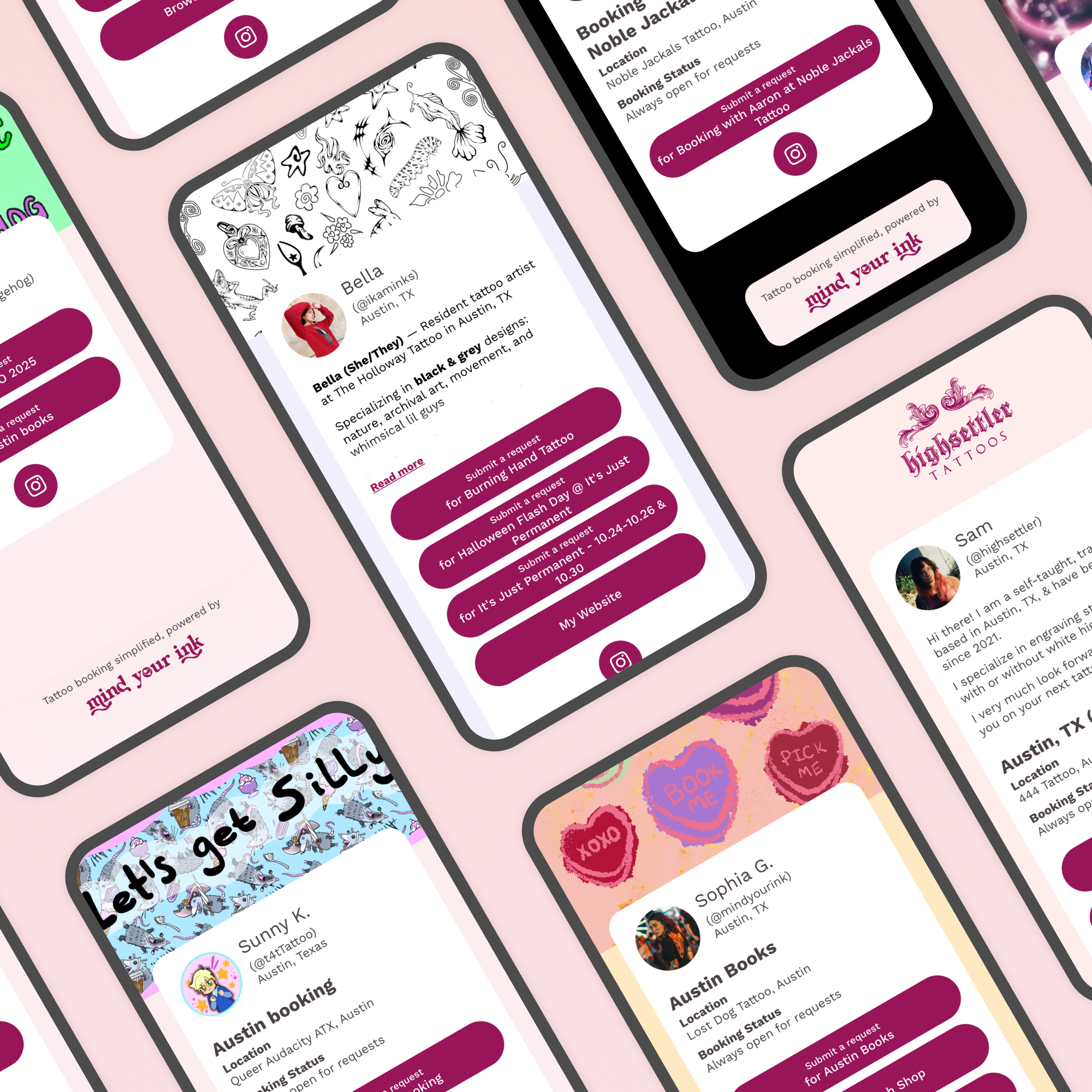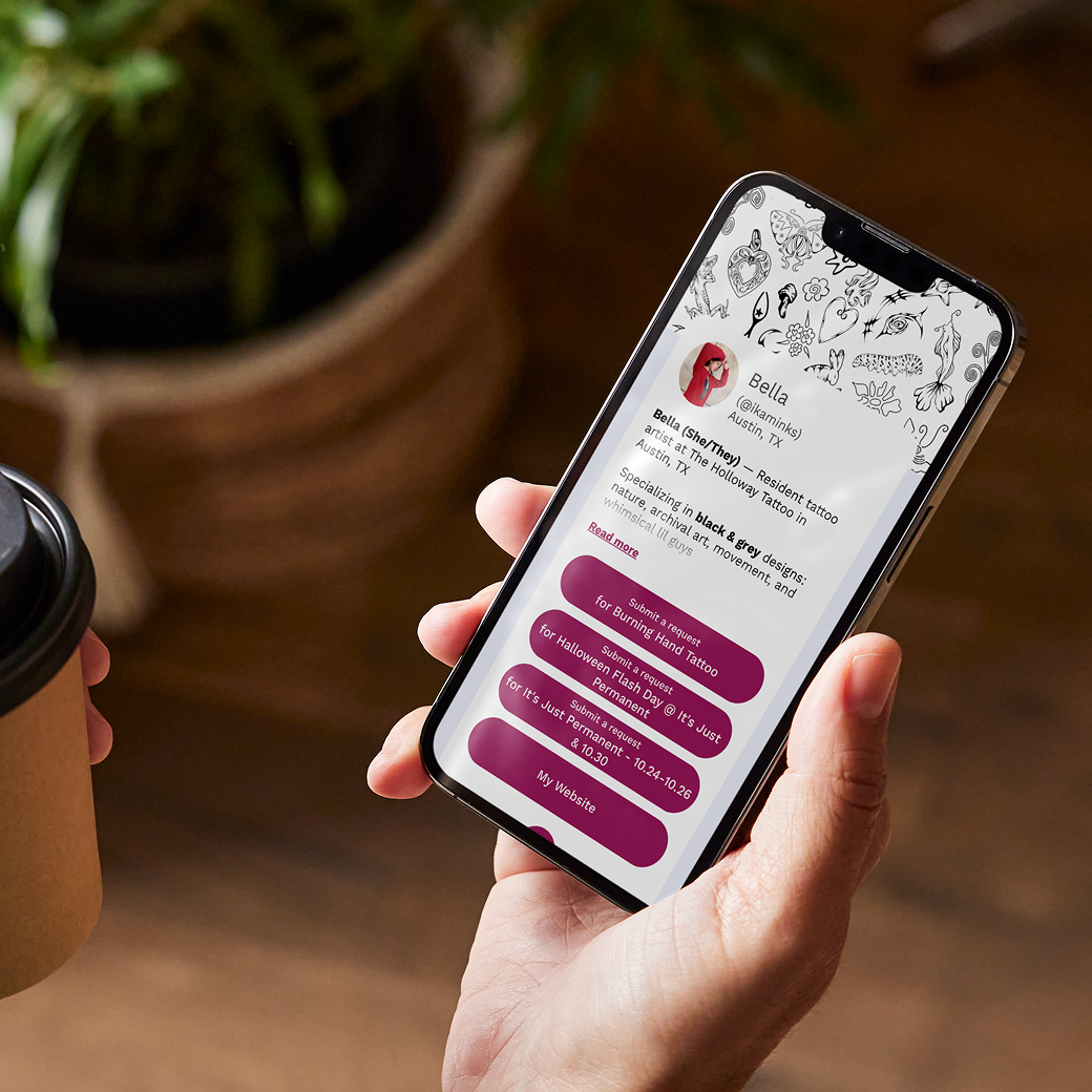Replace link-in-bio clutter with your own professional artist page. Share booking windows, flash shop, social links, consent forms, and more, all from one custom URL.